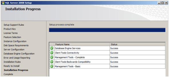 Be sure to log off and log back in once you change the local security policy so it will take effect. I reverted to a virtual machine snapshot so that there was no residual SQL data on the box and reinstalled again. Hopefully, the install will succeed and you’ll see the messages below.