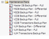 In the end, I have several maintenance plans. The backups are staggered so compute resources used during the backup process are minimized. The backup times are late at night when minimal changes are taking place. Backups are saved in separate directories for clarity. Logs are saved in their own directory. All user databases are set to use a full recovery model, as well. This enables us to back up transaction logs several times a day which will enable a point in time recovery. We chose to backup transaction logs every 8 hours. If needed, you can change this to suit your needs. So with a full, differential, and transaction log replay, you can recover your VMware databases to within 8 hours of the loss. A look at my final maintenance plan strategy is below.