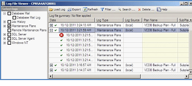 To view that status of each sub-task within the Maintenance Plan, including the final email of the success or failure of the maintenance plan, expand SQL Server Logs, right click Database Mail and choose View Database Mail Log. By default, the Database Mail logs are selected. Simply deselect the top-most Database Mail check box and select Maintenance Plans. You should see a list of the maintenance plans that have been run. Expand some of these, or the latest one, if that’s what you’re troubleshooting, and look for a big red X, indicating a failure. An email problem would be one of the last steps in the maintenance plan. An example is below. The text of the error you could see if you’re having email problems is: