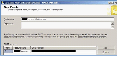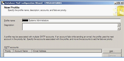 Enter Account Name. Under Outgoing Mail Server (SMTP), enter a destination email address and display name, something like SystemsAdministrators@company.com and Systems Administrators. Also include the hostname of the Exchange server from which you want to send SQL Server emails. Ensure Anonymous Authentication is selected for SMTP Authentication and select OK.
