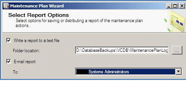 On the reporting options window, browse to your MaintenancePlanLogs folder. Check the box next to E-mail report and select your Systems Administrators.