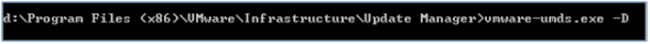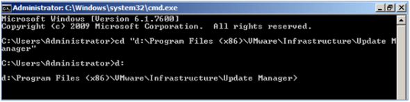 From the UMDS server, open a command prompt. Change directories to the UMDS installation path. For example, cd “d:\Program Files (x86)\VMware\Infrastructure\Update Manager”, then type d: to change your working directory to the D: drive. Your output should look similar to that shown below.