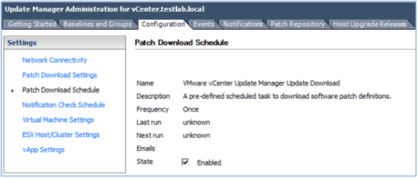 For your reference, I set these to Run Once and Now so that they didn’t run on their own. You’ll want to ensure your Patch Download Settings are correct and you can connect to your Update Manager repository before you run these, though.