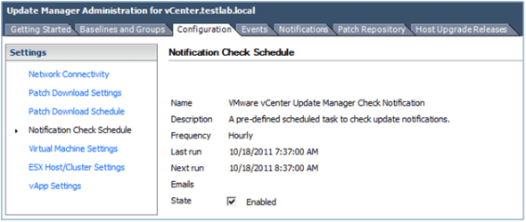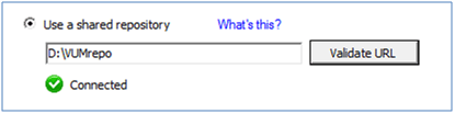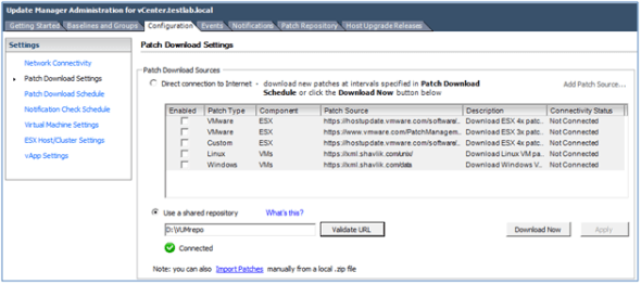 When you do, you can go back to the Update Manager configuration tab and click Validate URL. If you have configured VUM to use a shared repository and have the VUMrepo directory listed correctly, you should get a view similar to below showing you’re connected to the repository.