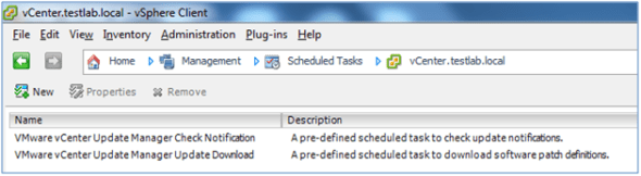 Feel free to change the Virtual Machine Settings, ESX host/Cluster Settings, and vApp settings. Changing these did not affect Update Manager operations in my environment. When the above settings are correct, you should see the following listed in the vCenter Scheduled Tasks.