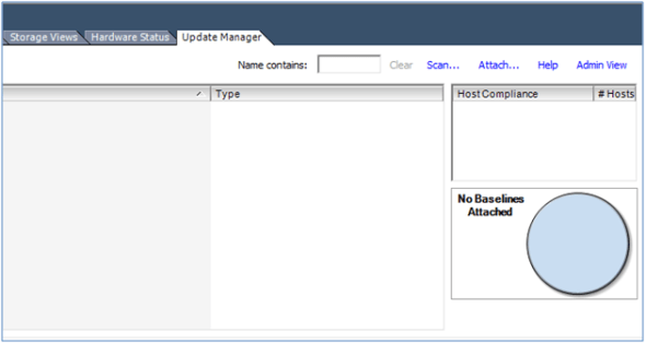 Update Manager in this particular environment is only being used to patch and update ESXi hosts. We’re not patching or updating guest operating systems. We’ll leave that to WSUS and SCCM. In order to scan hosts appropriately, we’ll ensure a baseline is attached to the hosts at the cluster level so Update Manager has something against which to scan. If you’re doing this for the first time, from the Compliance View, select the Cluster object from the left hand pane. In the upper right hand corner, select Attach…
