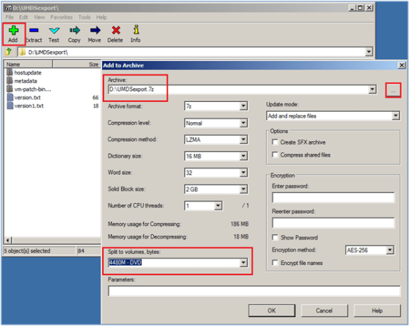 When you run 7-zip, navigate to your UMDS download location. Select all the files in your download directory and click the Add button in the upper left hand corner. A second window opens. Click the “…” browse button in the upper right hand corner and select the directory you wish 7-zip to export your files to. In my case, I chose something easy like D:\. It automatically chooses the directory’s name as the name of your zipped file, which is fine for our purposes. The only other change you should make is to select the Split to volumes, bytes option to DVD. This will make it easy to burn the least amount of DVDs required for transferring. When your satisfied, click OK.