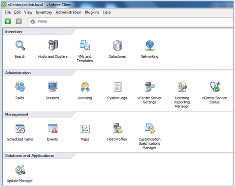 To actually view Update Manager in all its glory, from the vSphere Client, choose the Home button at the top of the window. At the bottom of the Home screen, under Solutions and Applications, you’ll see Update Manager.