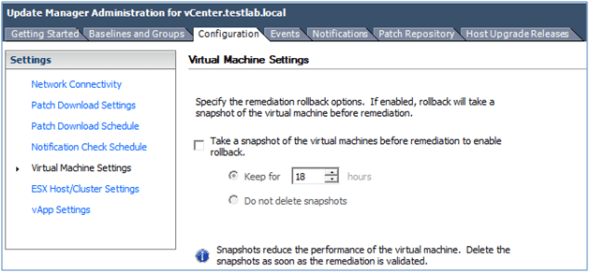 Because we’re not patching any VMs, only hosts, de-select the check box on the Virtual Machine Settings page, as well.