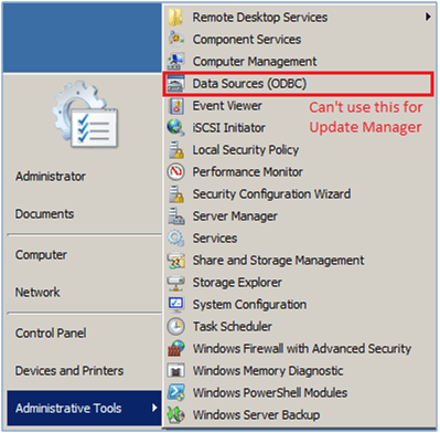 The ODBC connector program is installed by default in a Windows Server installation; however, in a 64-bit Windows installation, the default ODBC connection is 64-bit. For Update Manager, you cannot use the standard ODBC connector found in Administrative Tools.