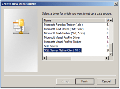 Choosing the System DSN tab and selecting Add… from the right, you’ll see a long list of all the DSNs you can create. Scroll all the way down and select SQL Server Native Client 10.0. Click Finish when you’ve selected it.