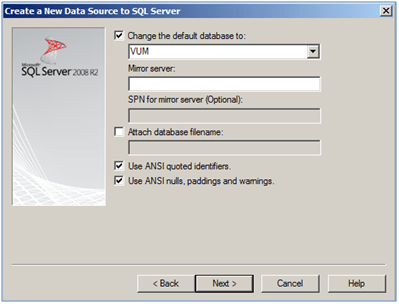 In the next windows, enter the name of your Update Manager database, VUM, and the hostname or IP address of your SQL Server. Click Next when finished.