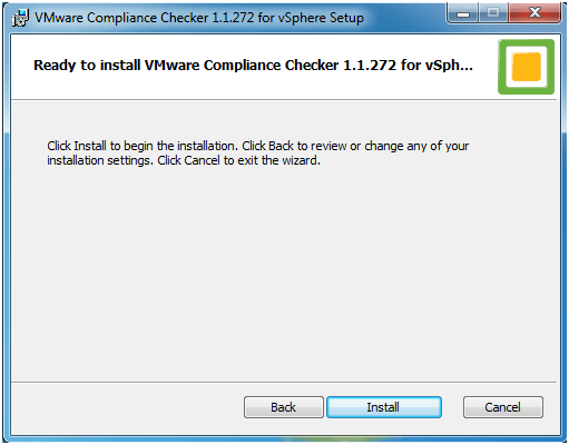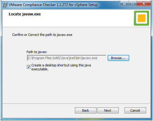 You’ll notice that it’s a Java-based program and automatically detects the Java installation directory. In a highly managed (read probably mucked up) domain, you may not get the desktop shortcut you asked for during the installation or the Start menu shortcut in the VMware folder. You’ll need local admin privileges to install and run the vSphere Compliance Checker and if neither shortcut appears after what appears to be a successful installation, you’ll want to navigate to the Compliance Checker’s installation directory and look for a file called vmcc.jar. Run this file with local admin privileges and you’ll run the program.