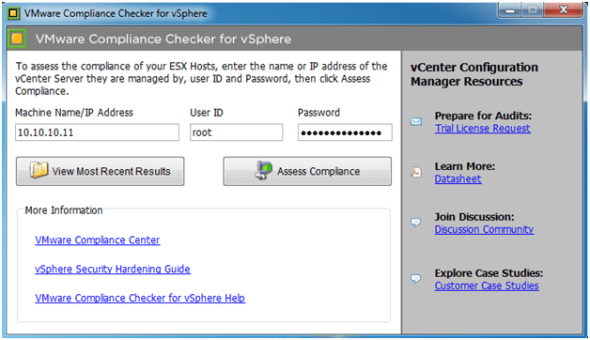 It’s a straight forward interface. Simply input vCenter’s IP or hostname and login credentials and click Assess Compliance.