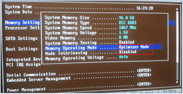 The setting you’ll choose here will depend on the amount of RAM you have and your goals. See Dell’s white paper for details. The servers I have the most experience with have 12 DIMMs of 8 GB, 1066MHz. We have no need for memory mirroring (your OS won’t see half your installed RAM) or emulating a 128-bit data bus and Single Device Data Correction that Advanced ECC Mode gives us. Advanced ECC Mode would take extra precautions against corrupted data in memory and can fix some errors if detected. Our applications are standard Windows network services and don’t necessarily need this extra protection from memory corruption or errors. Our choice here, then, is Memory Optimizer (or Optimized) Mode, the function of which is explained in Dell’s white paper and shown below.