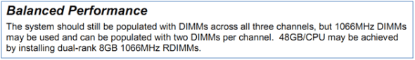 Here’s an example of DIMMs installed to take advantage of Memory Optimizer Mode. Note also that we are choosing a balanced performance configuration as described in Dell’s white paper, an excerpt of which is below: