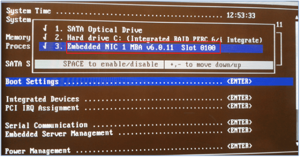 There’s no particular setting to change here, but I wanted to point out that by default, the R710 is able to PXE boot from Gb NIC 1. Unless you have cause for PXE booting your server, disable PXE booting. You don’t disable PXE from this menu, but this is where you’ll see if your server is configured to PXE boot. Once you disable PXE booting, you can return here to verify your settings.