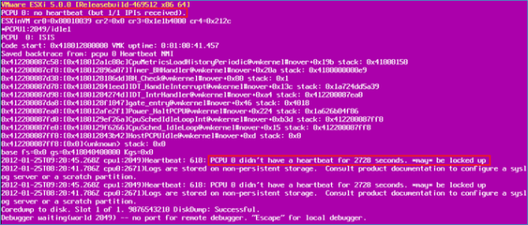 Posted: January 26, 2012 | Author: VirtuallyMikeB | Filed under: VMware, Windows | Tags: cpu has been disabled, cpu has been disabled by the guest operating system, esxi, esxi 5, esxi5, pcpu 0: no heartbeat, pcpu didn't have a heartbeat, psod, purple screen, purple screen of death, vmware, vmware workstation, vmware workstation 8, workstation 8 |Leave a commentWhile I’m traveling, I carry a beefy laptop as a mobile test lab. I fired it up recently after several weeks of no lab work and to my chagrin, looked up and saw the dreaded purple screen of death for the first time. I saw this as a good opportunity to research this particular PSoD and post my findings.