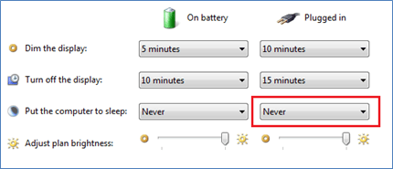 I’m using Windows 7 Ultimate 64-bit. You can change the power settings easily by going to Control Panel > Power Settings > Change when the computer sleeps, and changing the appropriate options to never put the computer to sleep.