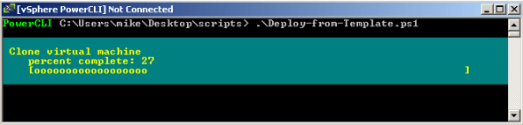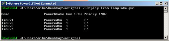 Posted: February 17, 2012 Filed under: PowerShell / PowerCLI, VMware | Tags: deploy vm from template, deploy vm from template powercli, powercli, small vm, vm powercli Leave a commentNow that I have a small VM for my test lab, I converted it to a template and looked for a cool way to deploy several VMs from this template with PowerCLI. Turns out it’s actually really easy, anti-climactic, even. The good folks over at VMPros.nl have an excellent tutorial on this topic. Alan Renouf (Twitter @alanrenouf) was the first to comment on their blogpost. He included a nice for loop to replace a single line for each VM deployment. I incorporated Alan’s suggestion as well as a few options from the PowerCLI New-VM cmdlet reference page, like adding the VM to a resource pool and then powering on the VM.