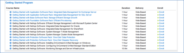 There are two Learning Maps for customers: The Head-Start Program and the Getting Started Program. Here are screen shot of each and the web-based courses available. For the test, you can focus on Data ONTAP 7-Mode Fundamentals, SnapMirror Disaster Recovery, and Technical Overviews.