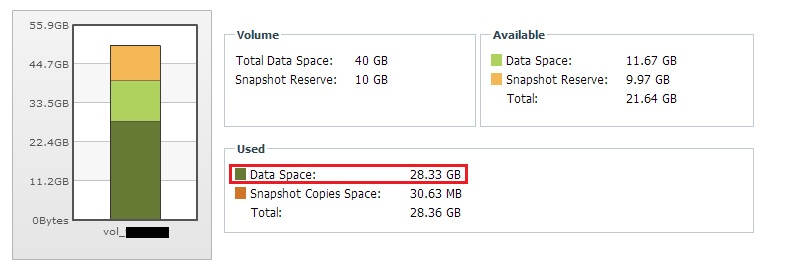 The resize is a bit more than what was actually needed, but the the idea was to make it big enough so as not to get the same error. There were no snapshots being taken so I had no historical reference to know how to size the snapshot reserve. You can see that the data space used from the volume is about 30GB, which includes the 15GB LUN and the 100% fractional reserve.
