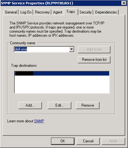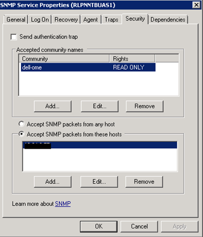 All servers need their OS (or hypervisor) and their iDRAC configured for SNMP. A Windows server is configured similar to the following screenshots.