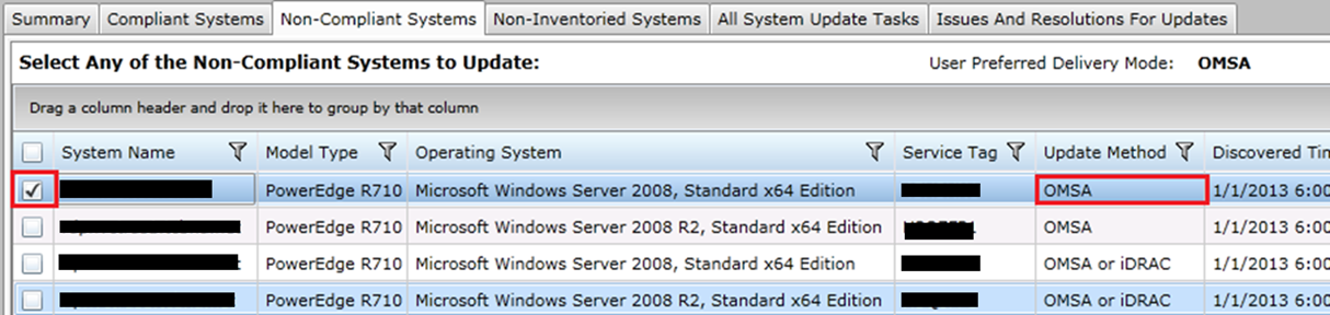 Choose the servers you wish to update by checking their checkbox. Note the supported Update Method, as well: (OMSA) or (OMSA or iDRAC).