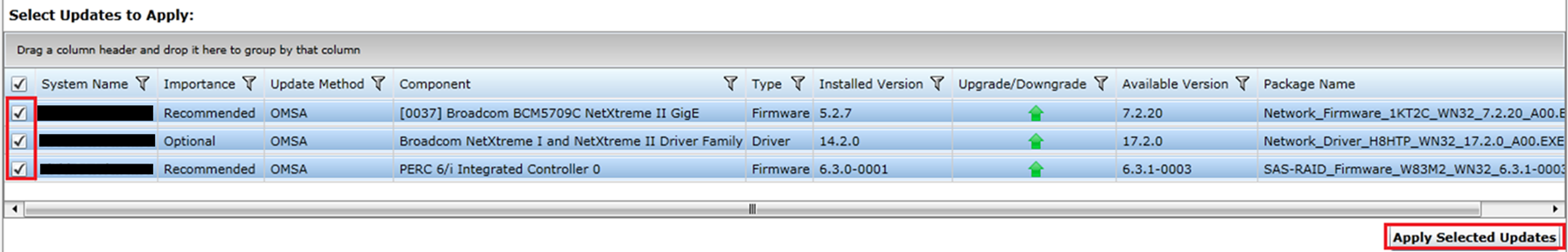 Further down, choose which updates you wish to apply, taking notice of their importance, type (driver or firmware), and upgrade or downgrade. In the lower right corner, choose to Apply Selected Updates.