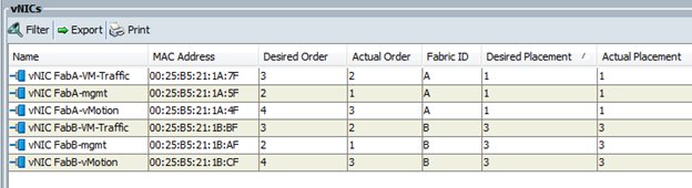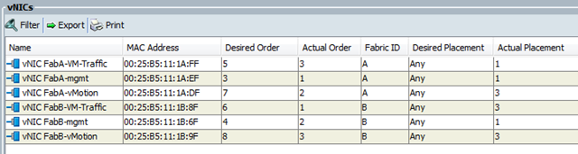 Or in the GUI, we can see the effects of the placement policies by viewing the Desired and Actual Placements.  The screenshots below are from different Service Profiles because I didn’t keep track of which ones I was taking screenshots of.  The first screenshot shows the vNIC placement before correction.  Again, the ESXi management vNICs are placed on Adapter 1 and the vMotion vNICs are placed on Adapter 3.