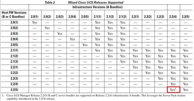 Clearly I didn’t deploy any UCS’s around the time that 2.2(4) was released because I totally missed this feature. In the distant IT past (pre 2.1 days), both the Infrastructure and Server firmware had to be at the same level to stay in support. Then came 2.1 which introduced backward compatibility with older Server firmware. Now you’re not necessarily forced to upgrade your blade firmware at the same time as your Infrastructure firmware. Nice. Now with 2.2(4) and Server Packs, blade firmware is backward compatible with Infrastructure firmware. Even better. Of course, this comes with caveats. That being that this feature starts at 2.2(4). So at this point, only 2.2(4) and 2.2(5) support such a configuration. But this is cool. Below is the latest mixed firmware version table from the release notes.